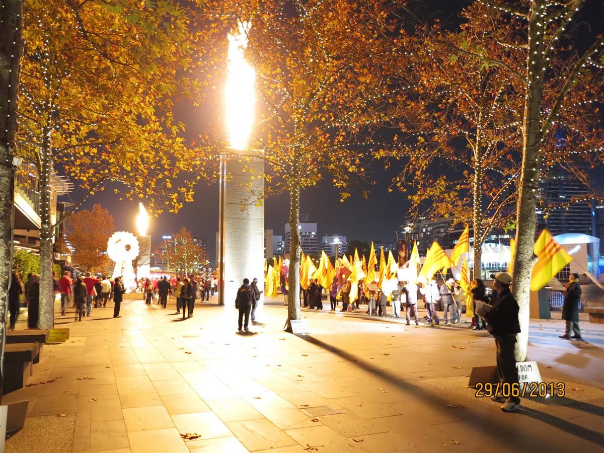 Cuộc biểu tình diễn ra thật vui nhộn. Sở dĩ vui nhộn là vì được hàng trăm những người đi xem trận đấu banh bầu dục (rugby) giữa 2 đội Wallabies và British & Irish Lions, lúc đi ngang qua đã nhập vào đoàn biểu tình để cùng hô hào, nhảy múa, phất cờ, hỏi han, tìm hiểu, ...